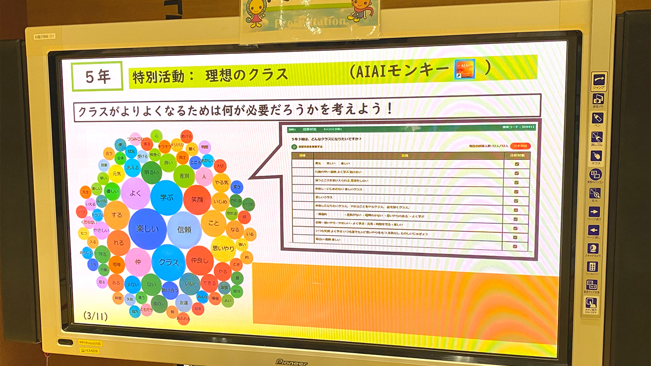 活用事例展示では、5年生の特別活動で活用されたAIAIモンキーの事例をご紹介していただきました。