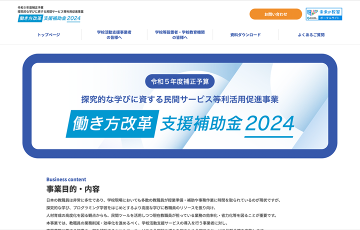 働き方改革支援補助金は、多忙な学校の教職員の業務の効率化・省力化を図ることを目的とした、経済産業省の令和5年度補正予算事業です。参加を申請し採択された学校は、令和5年度末まで、認定サービス事業者が提供するサービスを無料でお使いいただけます。