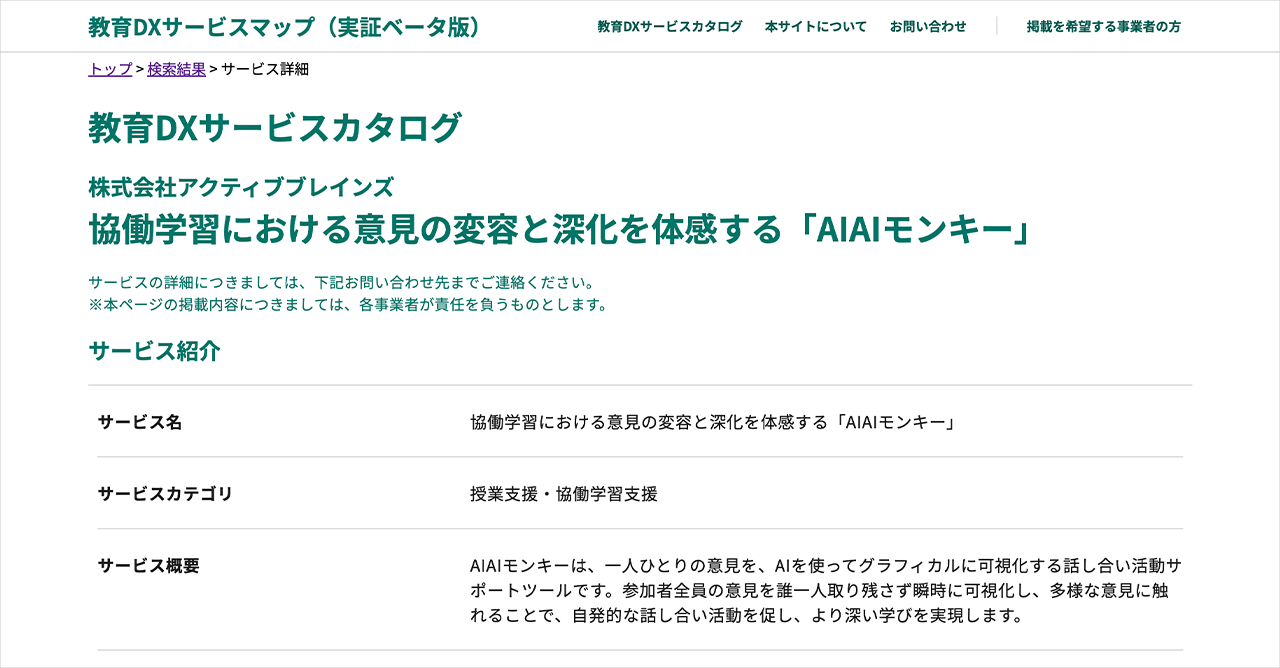 ※教育DXサービスマップとは、教育現場にICT環境の整備・導入を検討されている教育委員会や学校関係者の方々に活用いただくことを目的としたサービスマップ/カタログサイトです。